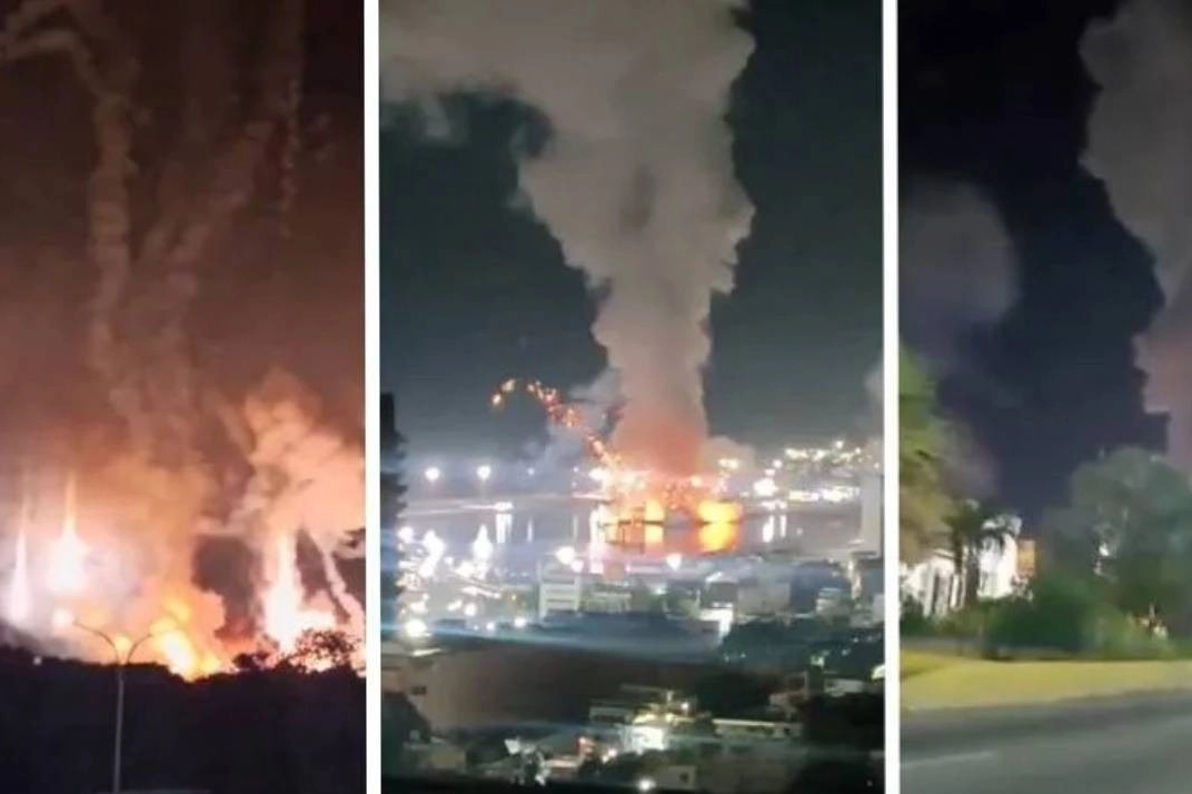 Patlamalar sonrası bölgedeki askeri alandan ve bir petrol rafinerisinden dumanlar yükseliyor.