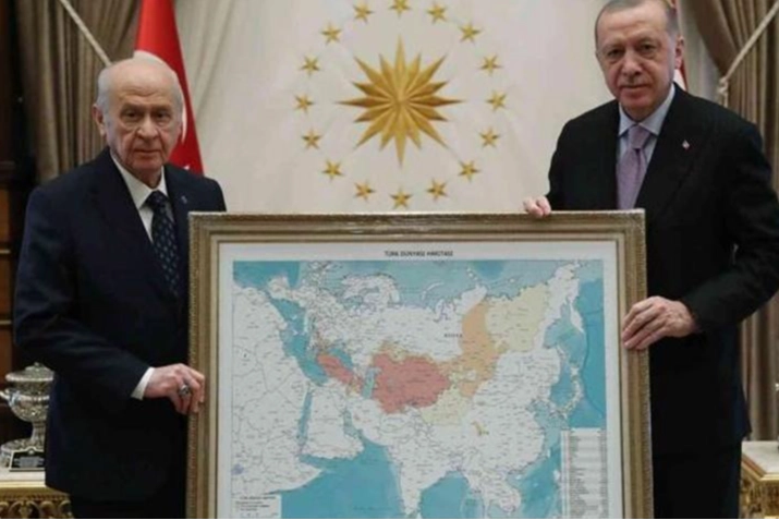 Kathimerini gazetesi bu sözlerin hemen devamında Bahçeli ve Erdoğan'ın Türk Dünyası haritasını tuttuğu fotoğraf hakkında 'Söz konusu haritaya göre Türk Dünyası, Türkiye'den başlayarak Batı Çin'deki Müslüman Uygur bölgelerine kadar uzanmakta, Türk hilali ile Azerbaycan, Türkmenistan, Özbekistan, Kazakistan ve Kırgızistan topraklarını kapsamaktadır. Ancak bugünkü gelinen durumda bu harita İran, Rusya, Çin, Balkanlar ve Kırım'ı da kapsıyor.
