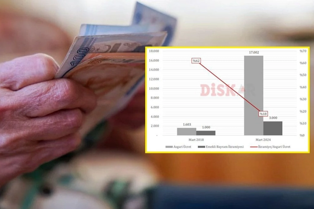 Emekli bayram ikramiyelerinin asgari ücrete oranı 2018 yılında yüzde 62 iken 2024 yılında yüzde 18'e kadar geriledi.