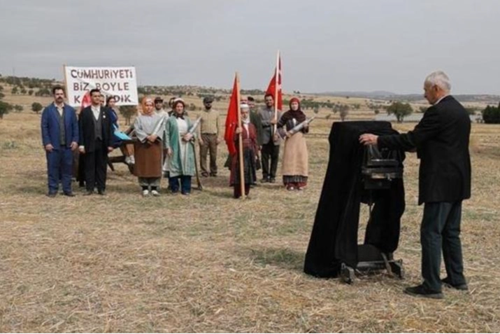 Uşak’ın ilk fotoğrafçısı ve milli mücadeledeki birliği en iyi yansıtan “Cumhuriyeti biz böyle kazandık” fotoğrafını çeken Hüsnü Kazım Özler’in oğlu Mustafa Özler ise fotoğraf makinesinin başına geçerek babasını canlandırdı.