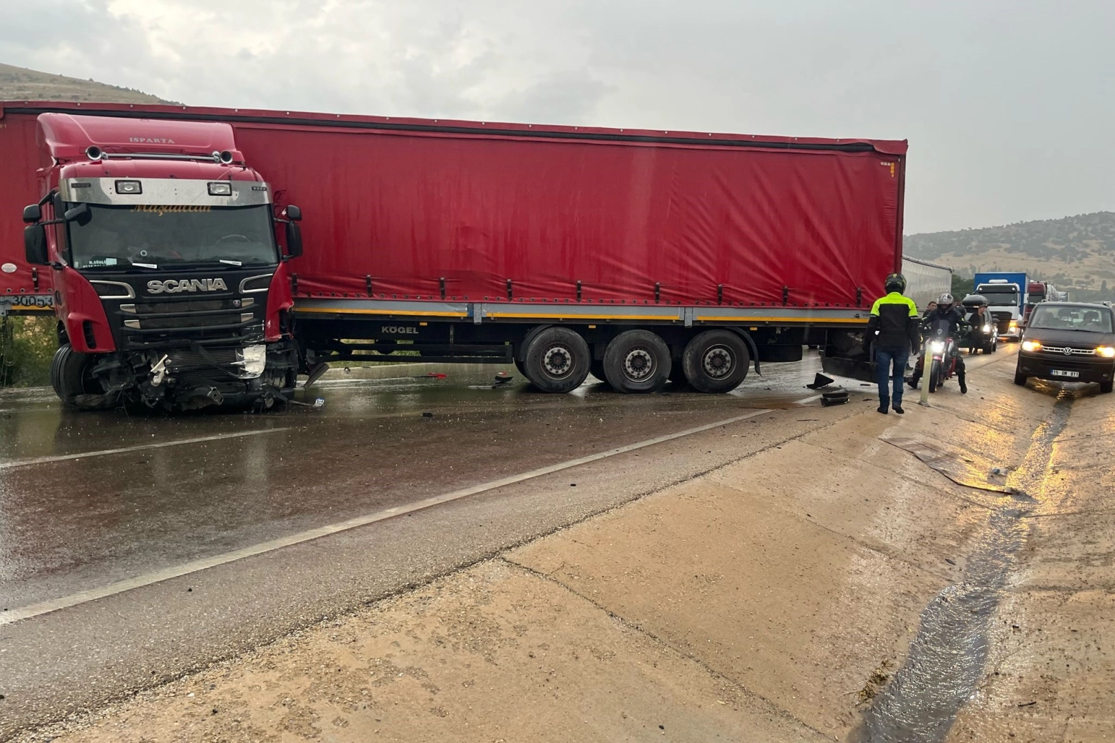 Kaza, Sandıklı ilçesi Başağaç rampasında meydana geldi. Edinilen bilgilere göre, R.S., yönetimindeki 32 PR 123 plakalı tır yağmurdan dolayı kayarak kontrolden çıktı. Araç ardından önünde seyreden F.E., idaresindeki EUFE727 yabancı plakalı otomobile çarptı. Tır ardından yol ortasına makasladı. Kazada tır sürücüsü yaralandı. Yaralanan sürücü çevredekilerin haber vermesi üzerine olay yerine gelen ambulansla hastaneye kaldırıldı. Kazadan dolayı Afyonkarahisar Antalya karayolunun bir yönünde uzun araç kuyrukları oluştu.