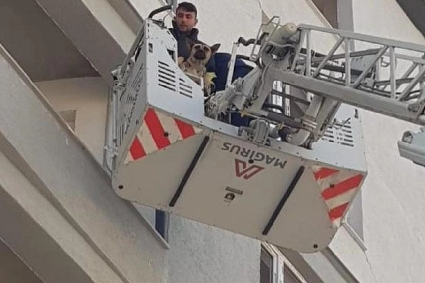 Dış cepheden uzatılan merdivenle dairenin balkon kısmına ulaşan ekipler, köpeği bulunduğu yerden kurtardı.