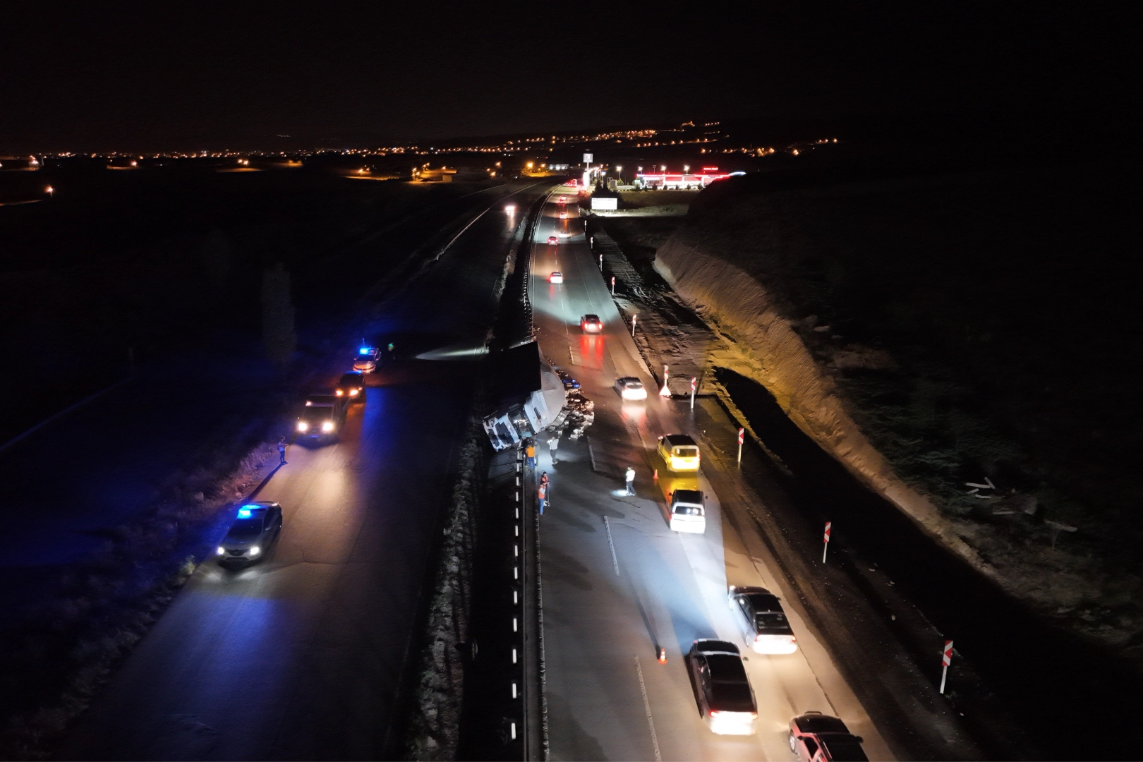 112 Acil Çağrı Merkezi'ne yapılan ihbar üzerine olay yerine polis ve itfaiye ekipleri sevk edildi. Trafik ekiplerince yol güvenliği sağlanarak araç trafiği alternatif yoldan yönlendirildi. İtfaiye ekipleri tarafından da tırın yanma riskine karşı tedbir alındı. Kazaya ilişkin inceleme başlatıldı.