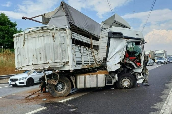 Çarpmanın etkisiyle Ahmet E. yönetimindeki tırın dorsesinden düşen 21 büyükbaş hayvan otoyola dağıldı.