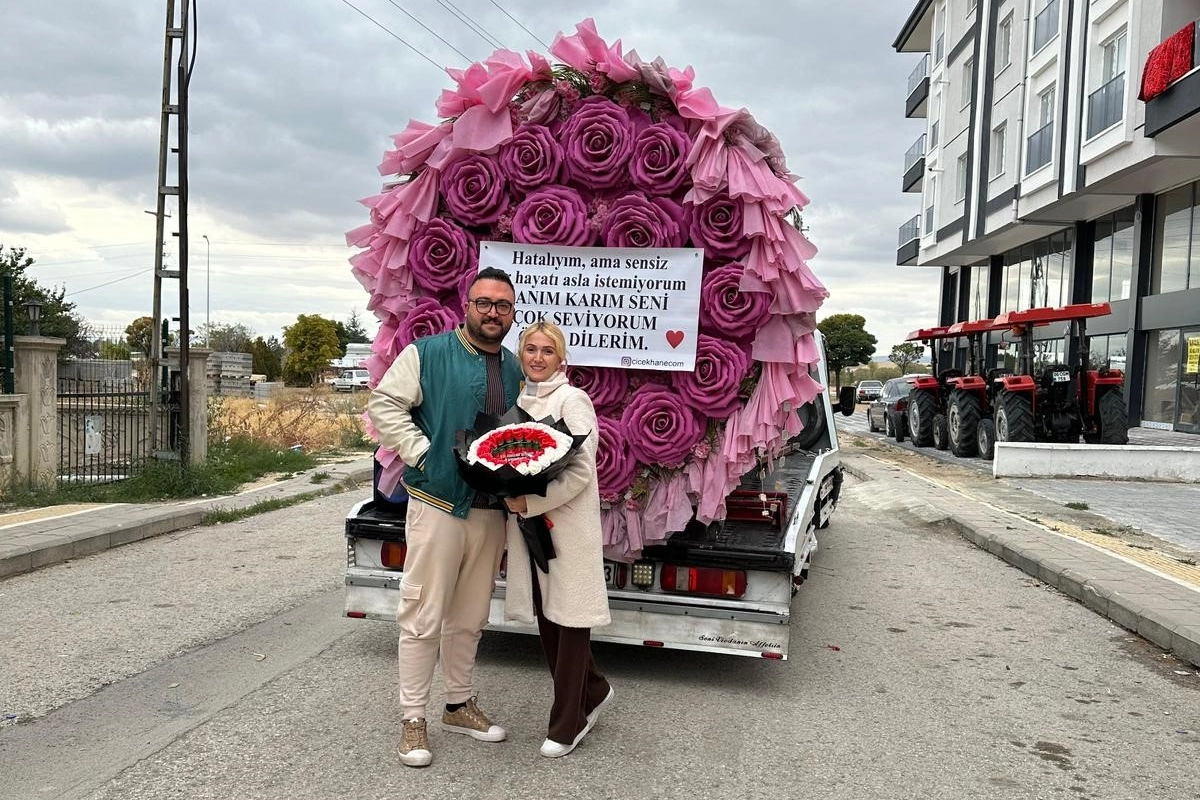 Akyurt’ta bugün görenleri hem şaşırtan hem de gülümseten bir olay yaşandı. Bir araç çekicisinin arkasına yerleştirilen dev buket çiçek dikkatleri üzerine çekti. Çiçeklerin yanında yer alan notta ise, "Hatalıyım, sensiz bir hayatı asla istemiyorum. Canım karım, seni çok seviyorum" ifadeleri yer aldı. Çekicinin önünden geçen vatandaşlar şaşırırken, sosyal medyada da hızla yayılan görüntü Akyurt’ta günün en çok konuşulan olayı haline geldi. Kimi "Gerçek aşk budur" derken, kimileri de "Ağabey sen ne yaptın da bu kadar özür diliyorsun" yorumunda bulundu.