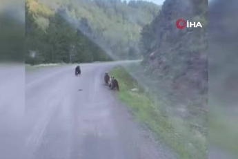 Beypazarı Karaşar Mahallesi'nde evine gitmek için yola çıkan bir vatandaş, yolda 3 tane ayı ile karşılaştı. Ayılara çarpmamak için yavaşlayan vatandaş o anları cep telefonu kamerasına kaydetti.