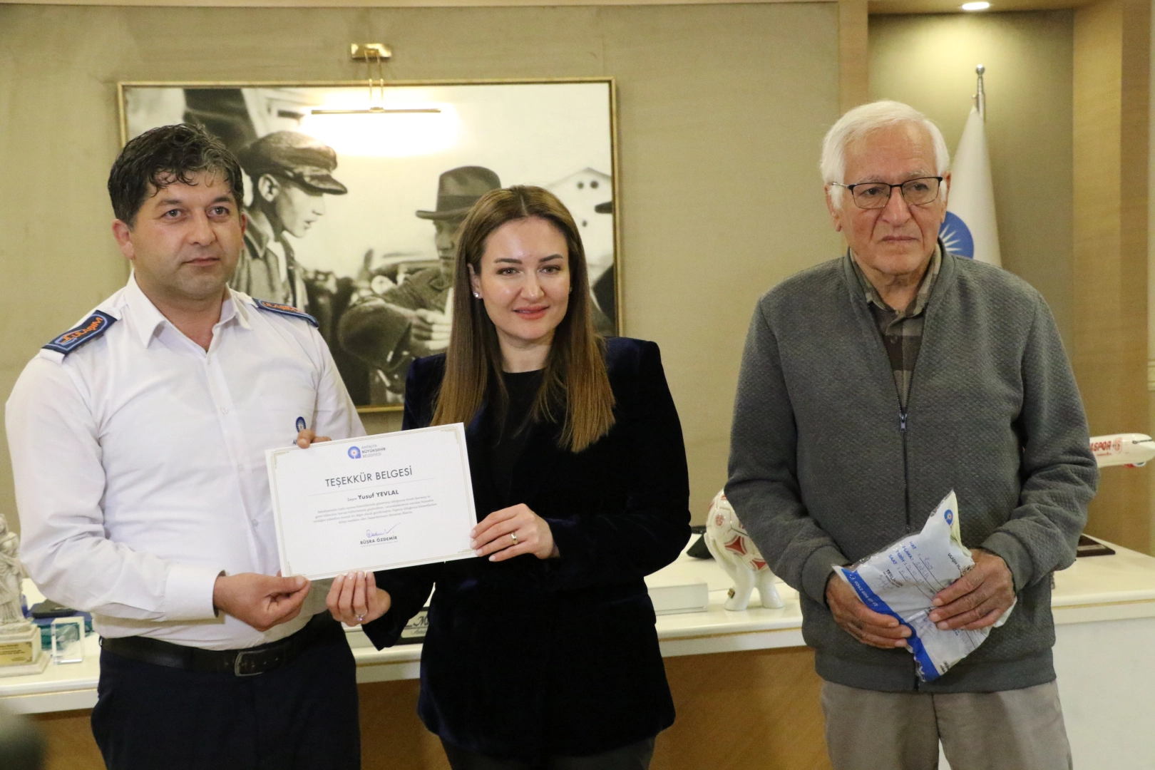 Antalya Büyükşehir Belediye Başkanlığı'na gelen İbrahim Gedik'e, çanta ve içinkiler Büyükşehir Başkan Vekili Büşra Özdemir tarafından teslim edilirken, şoföre de teşekkür belgesi verildi. "İnerken yan koltukta unutmuşum"