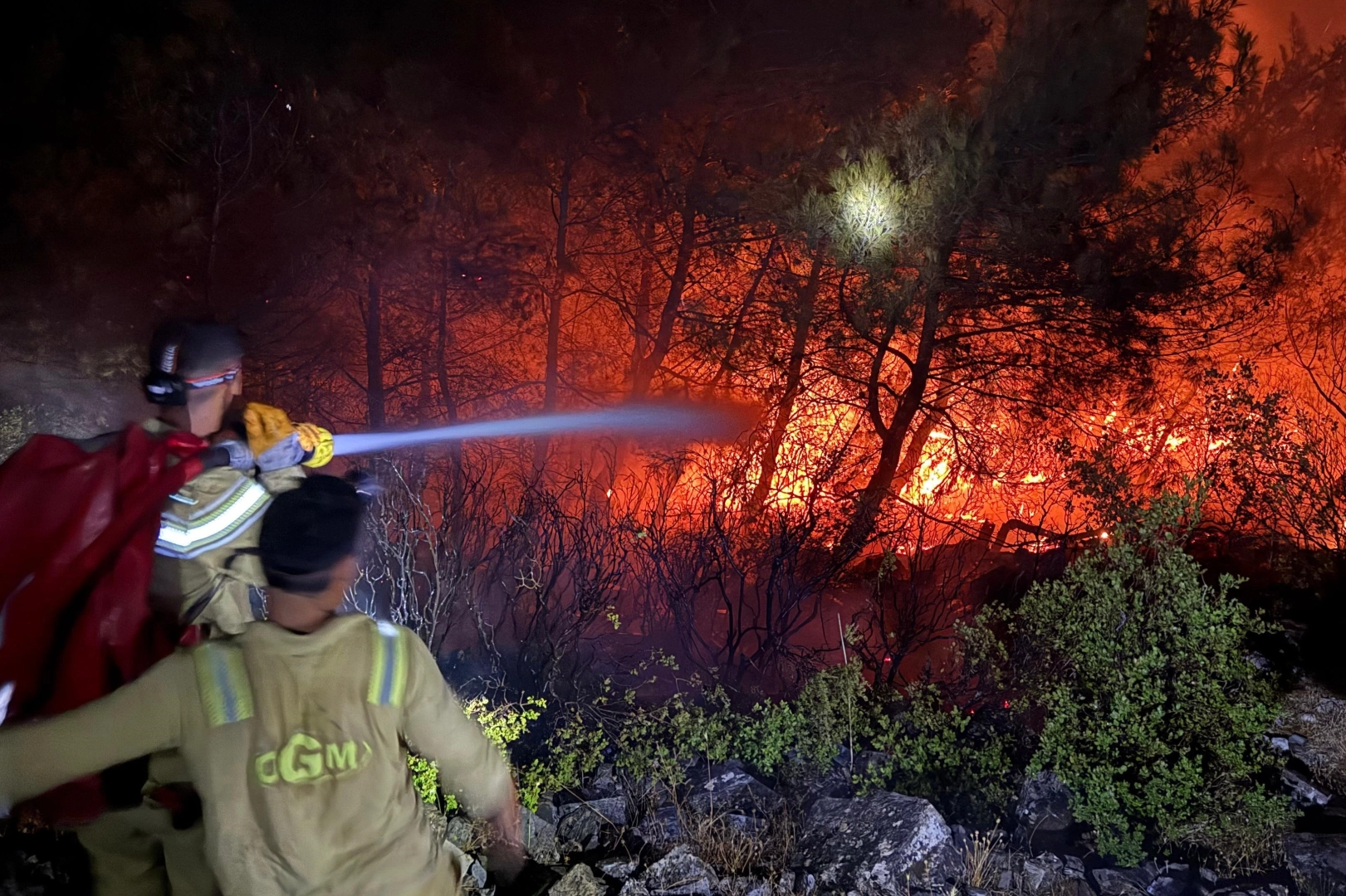 Havanın kararması ile birlikte bölgede alevler geceyi aydınlatırken, ekiplerin yangınla mücadelesi sürüyor.