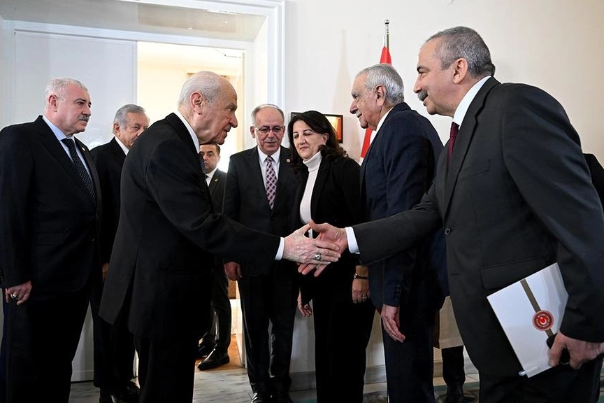 Bahçeli’nin TBMM’deki makamında gerçekleşen görüşme öncesinde Bahçeli, DEM Partili heyetini kapıda karşılayıp tokalaşmıştı. Görüşmede Bahçeli’ye MHP İstanbul Milletvekili Celal Adan da eşlik ediyordu.