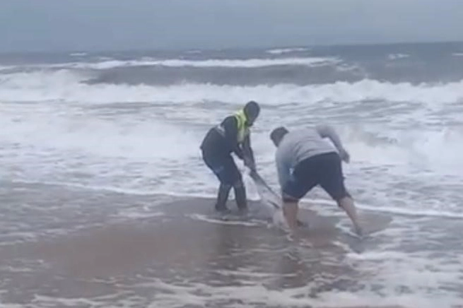Belediye personeli Doğukan Akıncı, yunus balığına ulaşarak onu kucaklayıp yeniden denize göndermeyi başardı. Yaşanan olay vatandaşların yüreğini ısıttı.
