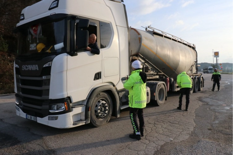 D-100 kara yolunun Bolu Dağı kesiminde yapılan denetimde, durdurulan tır, kamyon, otobüs ve minibüs gibi ticari araçların lastikleri kontrol edildi.