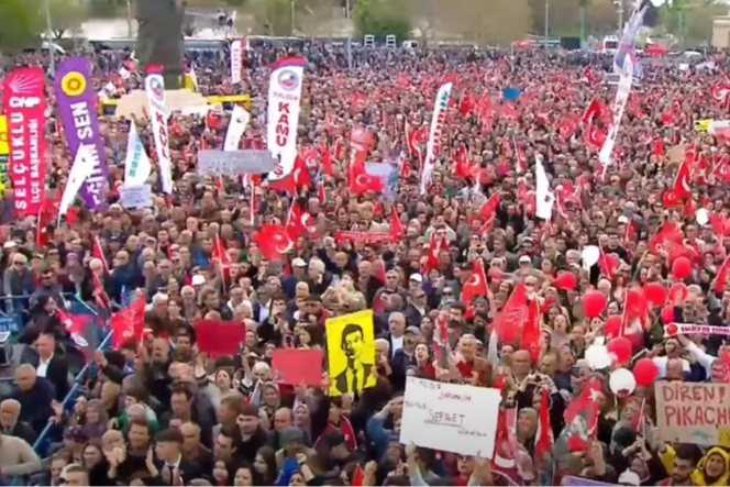 "Sesimi, yüreğimi, umudumu bu mesaja sığdırarak sizleri selamlıyorum. 19 Mart'tan bu yana ülkemizin dört bir yanında buluşan bu millet adil, özgür ve müreffeh bir gelecek için ses veriyor. Yurdumun tam ortasında bu kadim şehirde basiretli, saygılı, derinlikli Anadolu kültürü bizi bağrına basıyor. Bu bereketli ovanın, bu makul şehrin alın terine, sabrına selam olsun. Bugün aranızda değilim ama azımızı çoğa sayın. Sizi bu meydanda selamlayan her bir arkadaşımı Ekrem İmamoğlu sayın. 19 Mart'tan bu yana ülkemizin dört bir meydanında bulunan millet, adil günler için ses veriyor.