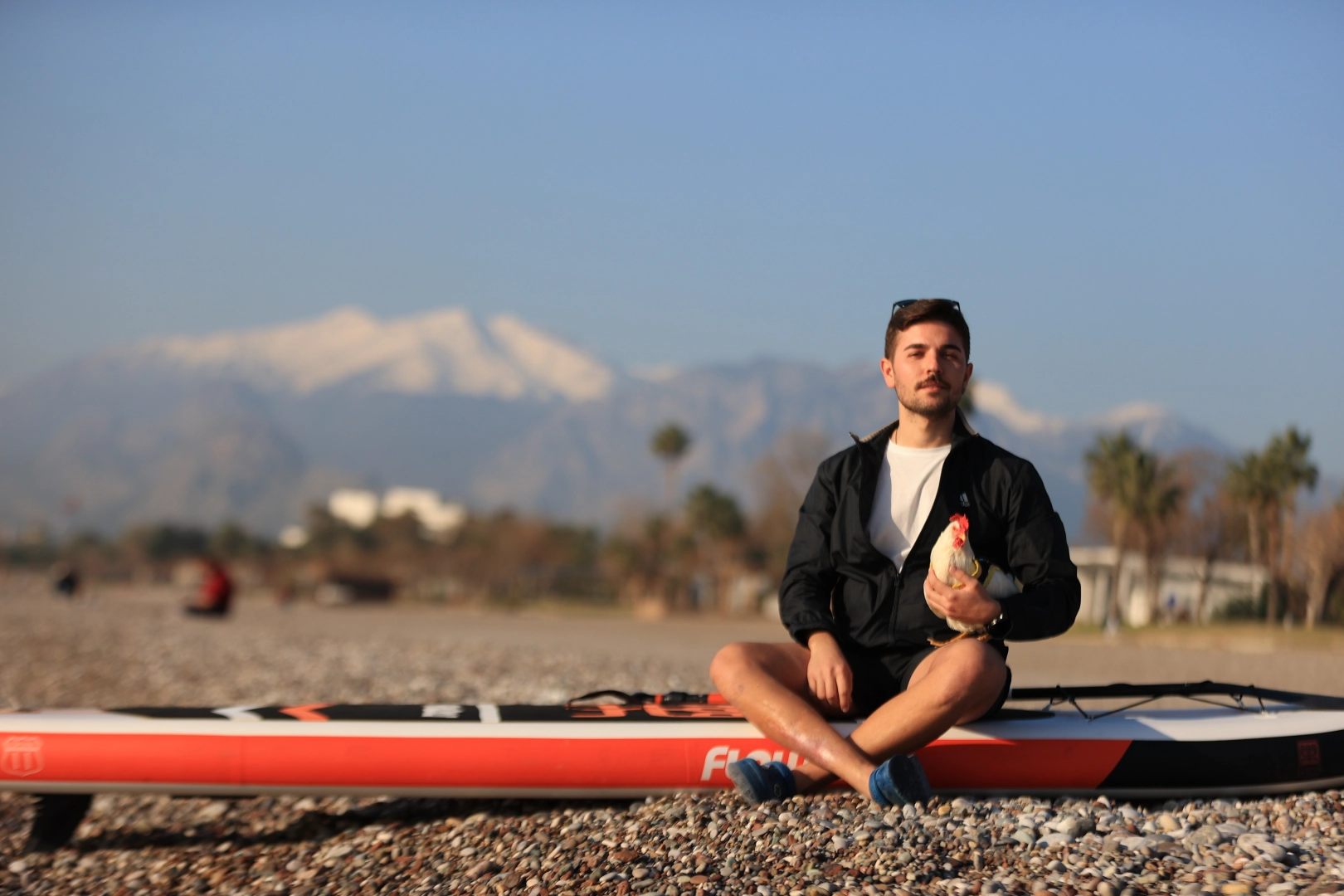 Profesyonel olarak ayakta kürek sörfü eğitmenliği yapan Özden, sörf yaparken de tavuğu yanına almayı ihmal etmiyor.