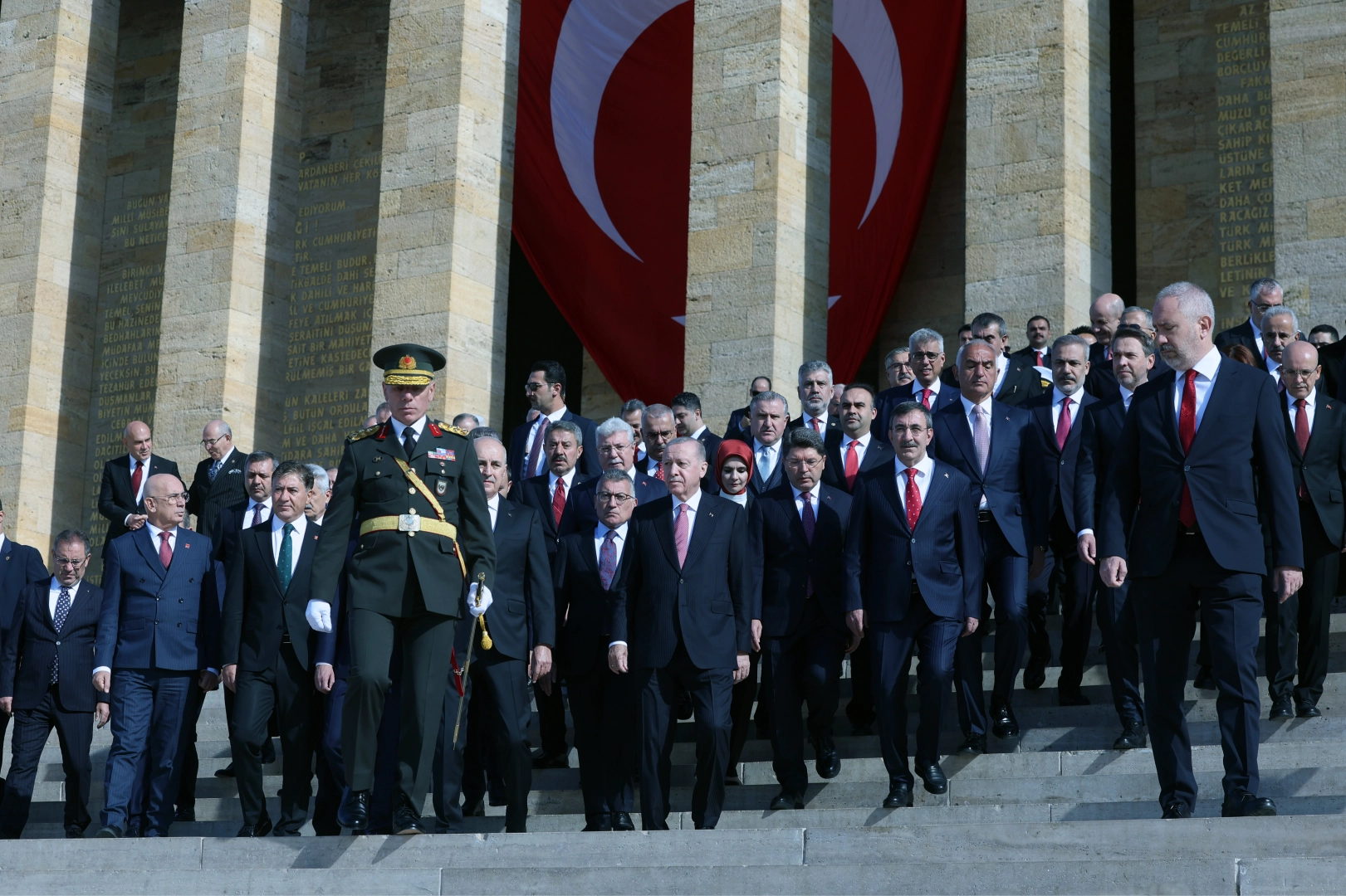 Cumhurbaşkanı Erdoğan'ın, üzerinde ay yıldız bulunan çelengi Atatürk'ün mozolesine bırakmasının ardından saygı duruşunda bulunuldu ve İstiklal Marşı okundu.