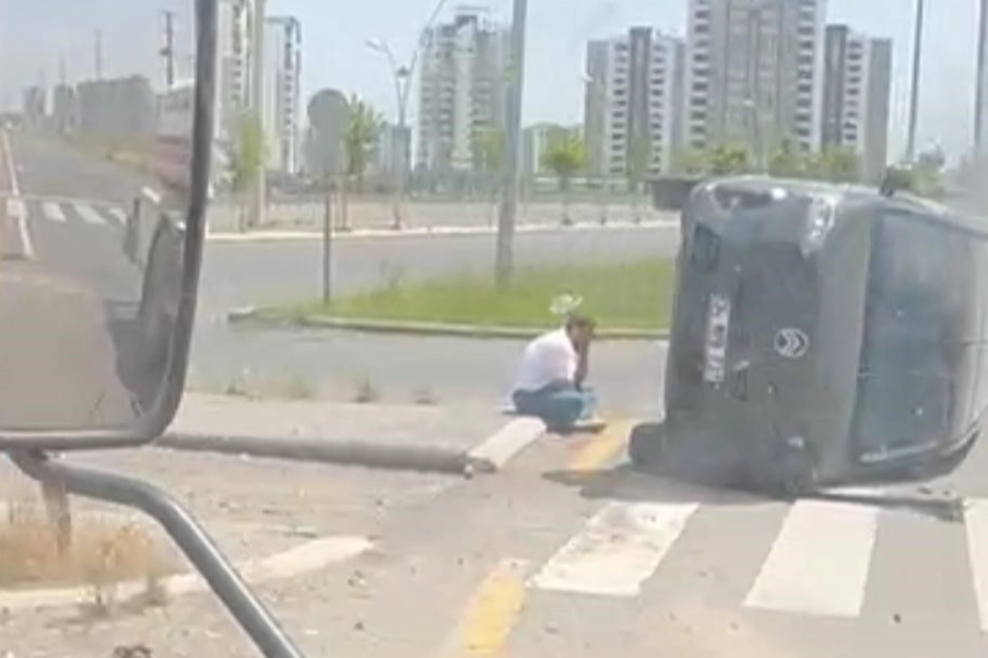 Diyarbakır’ın Kayapınar ilçesinde kaza geçiren sürücü, yan yatan kamyonetinin başında bekledi.
