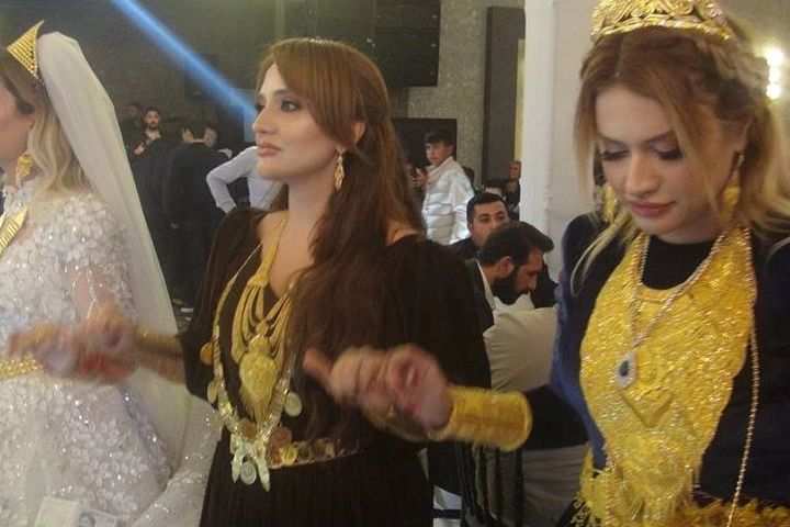Gecede, geline takılmak için korumalar eşliğinde sahneye getirilen bir valiz dolusu 8 kilogram ağırlığında bilezik, taç, kemer, gerdanlık, kolye gibi takılar takıldı