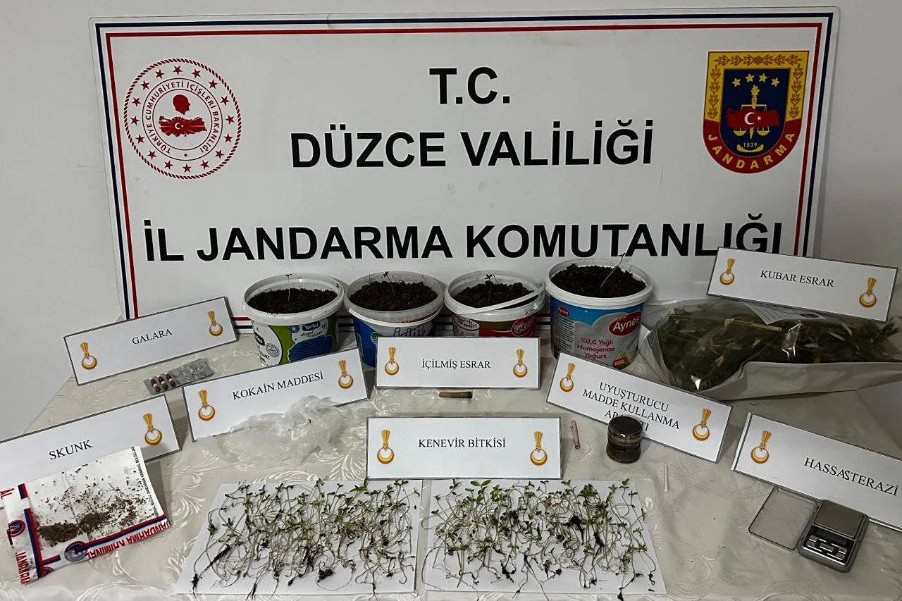 Düzce Cumhuriyet Başsavcılığı koordinesinde İl Jandarma Komutanlığı Narkotik Suçlarla Mücadele Şube Müdürlüğü ekipleri tarafından yürütülen çalışmalarda Azmimilli Mahallesi’nde bir şahsın yasadışı kenevir ekimi yaptığı ve uyuşturucu madde imal edilip sattığı belirlendi. Eve yapılan baskında 225 kök kenevir bitkisi, 247 gram kubar esrar, 9 gram kokain, 1 gram skunk, 6 adet uyuşturucu hap, 1 adet hassas terazi, 3 adet uyuşturucu madde kullanma aparatı ele geçirildi. Şahıs "uyuşturucu madde imal ve ticareti, yasadışı ekim ve uyuşturucu madde kullanma ve bulundurma" suçlarından gözaltına alındı.