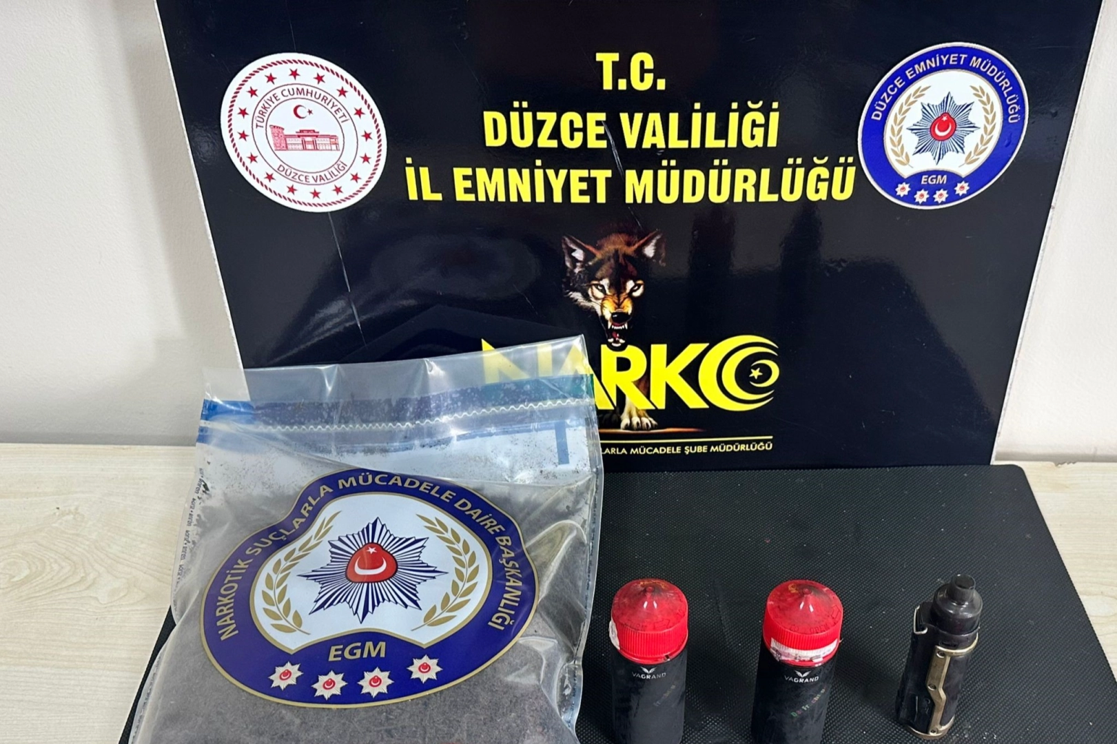 Düzce Cumhuriyet Başsavcılığı koordinesinde Narkotik Suçlarla Mücadele Şube Müdürlüğü ekiplerince yapılan çalışmalarda 3 parça halinde 210 gram sıvı sentetik kannabinoid maddesi ele geçirildi. Olayda 6 suç kaydı bulunan E.B. (21) gözaltına alındı. Hakkında "uyuşturucu madde ticareti yapmak" suçundan işlem yapılan şüpheli, Düzce Cumhuriyet Başsavcılığı tarafından sevk edildiği sulh ceza hakimliğince tutuklandı.