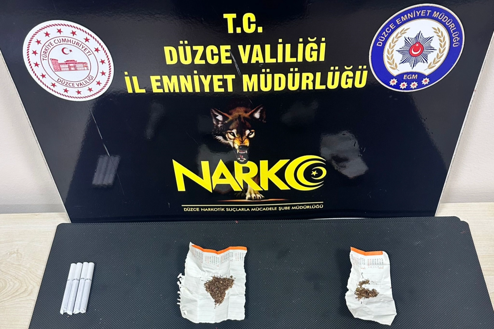 Düzce Cumhuriyet Başsavcılığı koordinesinde Narkotik Suçlarla Mücadele Şube Müdürlüğü ekiplerince uyuşturucu ile mücadele sürüyor. Polis ekipleri tarafından Karaca Mahallesi'nde 2 şahsa yönelik yapılan operasyonda 3 parça halinde toplam 10 gram sentetik kannabinoid maddesi, 1 gram metamfetamin maddesi, 4 adet içime hazır uçlarında uyuşturucu madde bulunan sigara ve 1 adet uyuşturucu madde kullanım aparatı ele geçirildi.Uyuşturucu madde ticareti yapmak suçundan işlem yapılan S.D. ve S.O. isimli şahıslar Cumhuriyet Başsavcılığı tarafından sevk edildiği Sulh Ceza Hakimliği tarafından tutuklandı. Şüphelilerden uyuşturucu madde satın aldığı tespit edilen 1 şahıs hakkında uyuşturucu madde kullanma suçundan adli işlem yapıldı.