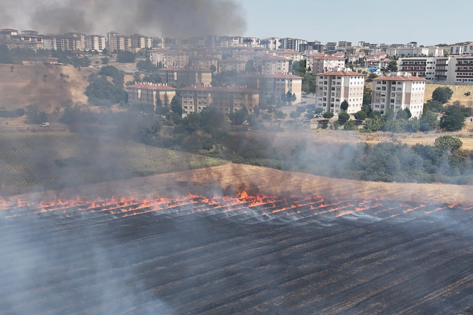 Edirne'nin Kurtuluş Mahallesi'nde öğle saatlerinde başlayan yangın, kısa sürede kontrolden çıktı. Rüzgârla birlikte büyüyen alevler, hem mahalleliyi hem sürücüleri tedirgin etti. Yoğun duman nedeniyle görüş mesafesi düştü. Polis ekipleri, yangını izlemek için yol kenarında duran sürücüleri ise megafonla uyararak trafiği açmaya çalıştı. Ekipler alevlerin binalara ulaşmaması için adeta zamanla yarıştı. Uzun uğraşlar sonucu kontrol altına alınan yangında onlarca dekar anız ve ağaçlık alan küle döndü. Yangında bir ayçiçeği tarlası da zarar gördü.