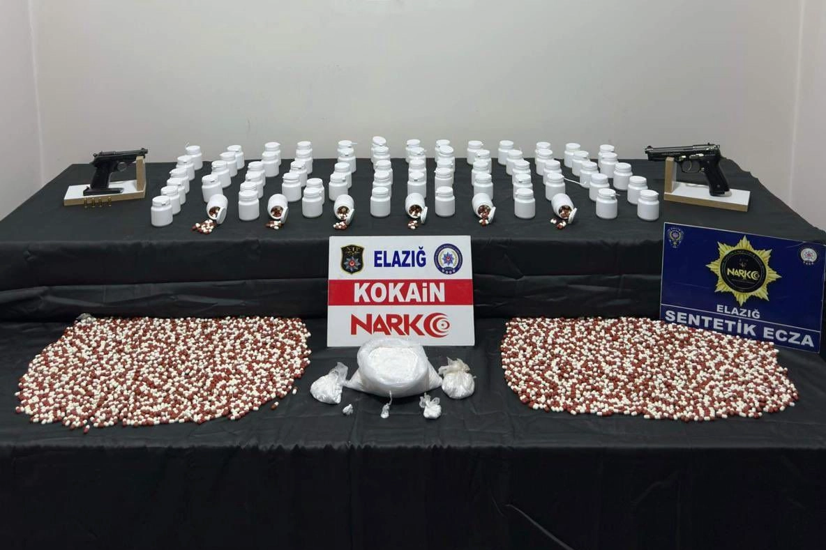 Elazığ Cumhuriyet Başsavcılığı koordinesinde Elazığ İl Emniyet Müdürlüğü Narkotik Suçlarla Mücadele Şube Müdürlüğü ekipleri, uyuşturucu ve uyarıcı madde ticareti, kullanımı ile sevkiyatının engellenmesine yönelik çalışmalarını sürdürüyor. Bu kapsamda belirlenen hedeflere yönelik geniş kapsamlı bir operasyon gerçekleştirildi. Eş zamanlı olarak 4 ayrı ikamet ve 1 araçta icra edilen operasyonda, narkotik ekiplerinin yaptığı detaylı aramalarda 6 parça halinde toplam 802 gram kokain, 69 kutu içerisinde 3 bin 873 adet sentetik ecza, 2 adet ruhsatsız tabanca ve bu tabancalara ait 4 adet fişek ele geçirildi. Suç unsurlarına el konulurken olayla bağlantılı olduğu tespit edilen 2 şüpheli şahıs kıskıvrak yakalanarak gözaltına alındı. Emniyet Müdürlüğü’ndeki işlemlerinin ardından adli makamlara sevk edilen 2 şüpheli şahıstan 1’i, çıkarıldığı mahkemece tutuklanarak cezaevine gönderildi.
