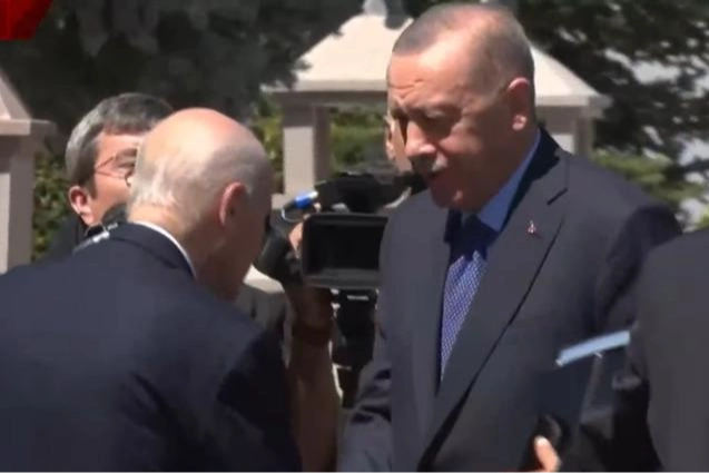 Bahçeli, Erdoğan'ı kapıda karşıladı. İki lider kameralara görüntü verdikten sonra görüşmeye başladı.