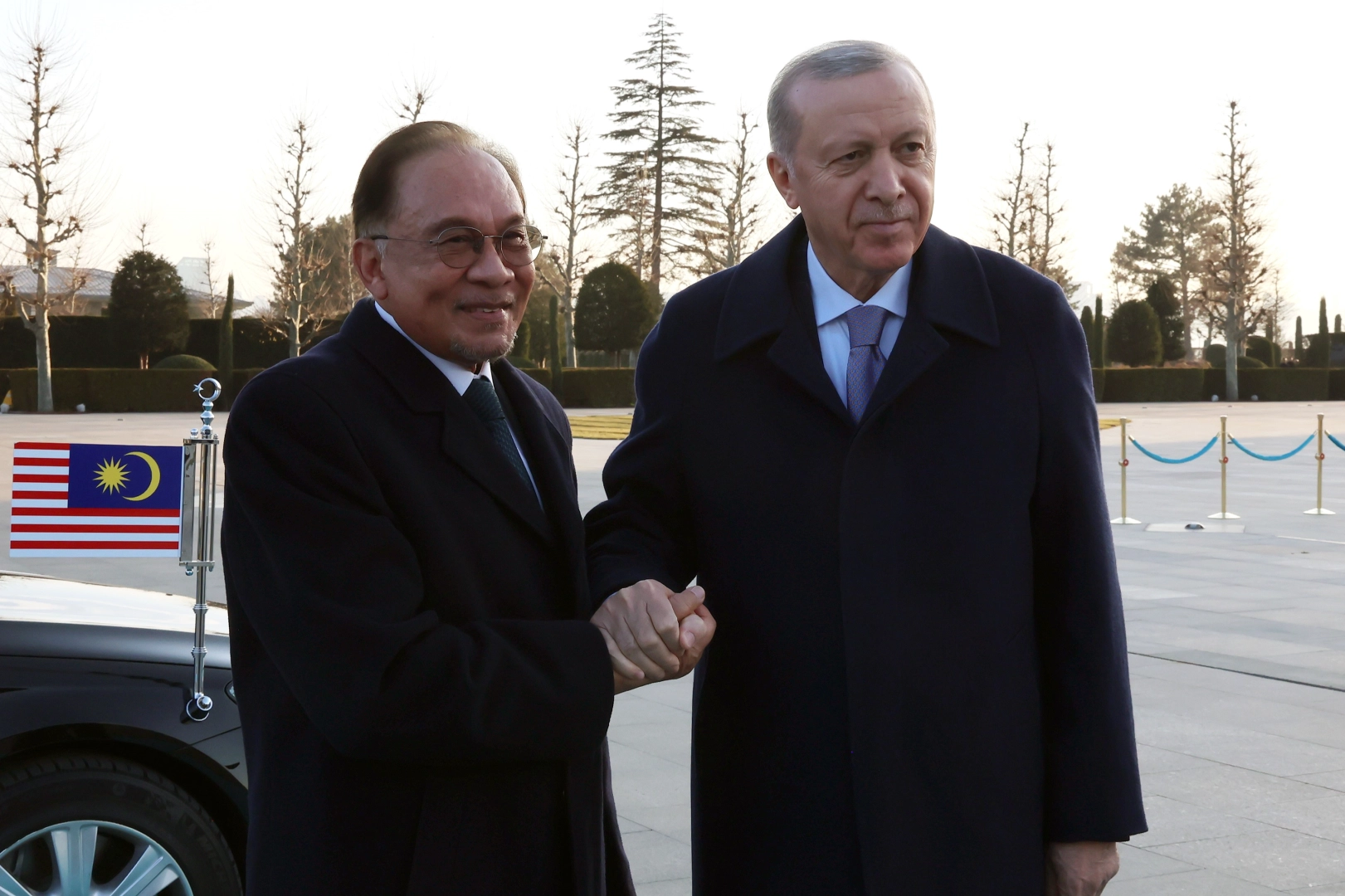 Heyetlerini birbirlerine takdim eden Erdoğan ve Enver İbrahim, merdivenlerde Türkiye ve Malezya bayrakları önünde gazetecilere poz verdi. Erdoğan ve İbrahim, Türkiye-Malezya Yüksek Düzeyli Stratejik İşbirliği Konseyi Birinci Toplantısı'na katılacak ve daha sonra ortak basın toplantısı düzenleyecek.