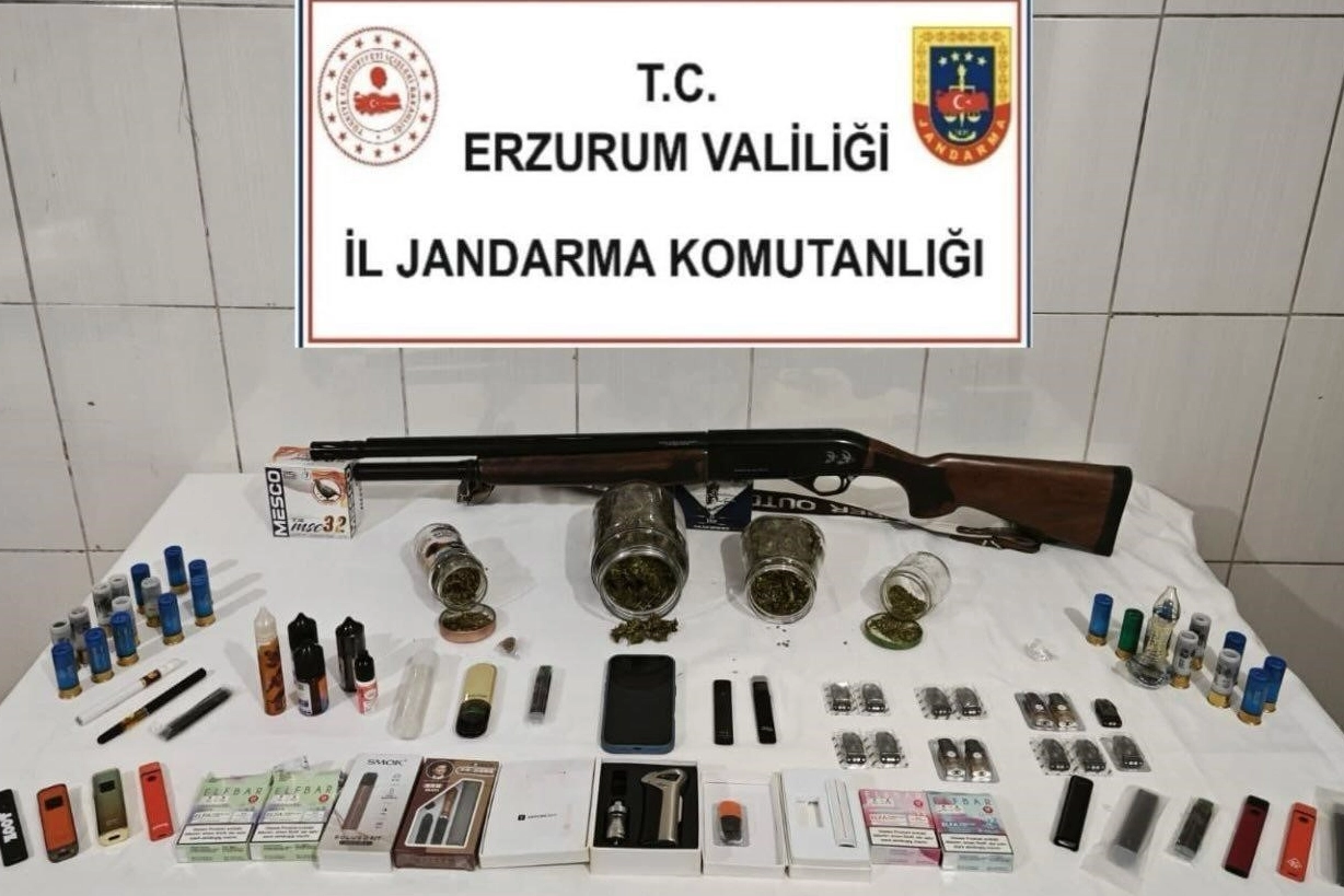Erzurum Cumhuriyet Başsavcılığı koordinesinde Pazaryolu ilçesinde gerçekleştirilen operasyonda; 167 gram kubar esrar, 8 gram kokain, 1 adet uyuşturucu kullanma aparatı, 12 adet uyuşturucu madde kullanıldığı değerlendirilen boş likit şişesi, 1 adet ruhsatsız av tüfeği, 67 adet 12 cal. av tüfeği fişeği, 29 adet kaçak elektronik sigara cihazı, 19 adet kaçak elektronik sigara cihazı başlığı ve 1 adet suçta kullanıldığı değerlendirilen cep ele geçirildi.