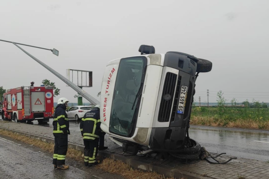 Kaza, sabah saatlerinde Muratlı’nın İstiklal-Kurtpınar OSB Mah.’de meydana geldi. İddiaya göre, Lüleburgaz istikametinden Süleymanpaşa yönüne doğru seyir halindeki M.B. sevk ve idaresindeki 59 AGS 240 plakalı fabrika servis aracı, Muratlı’da aracın lastiğinin patlaması sonucu yoldan çıkarak elektrik direğine çarparak devrildi. Kazada sürücü M.B. ile araçtaki 6 işçi yaralandı.