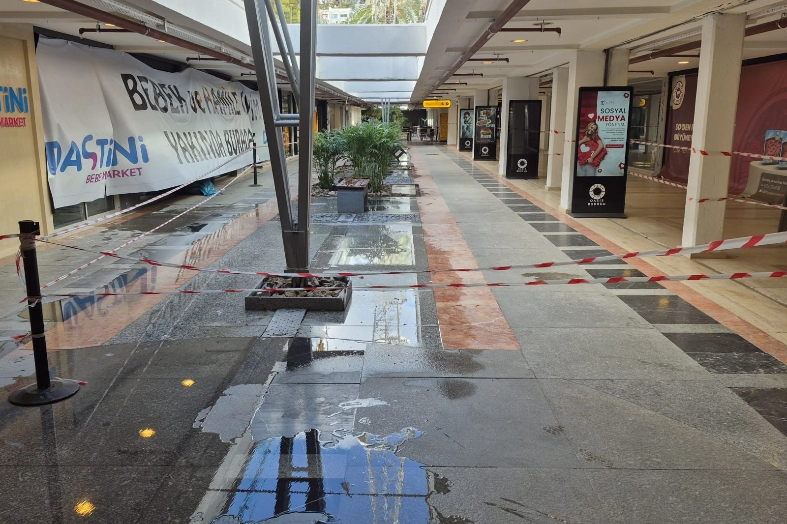 Muğla'nın Bodrum ilçesinde bulunan Oasis Alışveriş Merkezi, fırtınanın ardından ortaya çıkan tehlike nedeniyle kısmen kapatıldı. Şiddetli rüzgarın etkisiyle kopan brandalar ve yerinden oynamaya başlayan demir direkler, AVM içinde can güvenliğini tehdit etti.