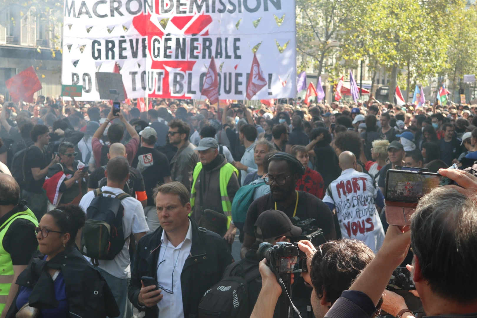 Yerel saat ile 14.00'te başkent Paris'teki Bastille Meydanı'ndan başlayan gösterilerde kalabalık arasındaki çeşitli gruplar Fransa Cumhurbaşkanı Emmanuel Macron'u istifasını istedi. Protestocular ayrıca İsrail'in Gazze şehrini işgaline yönelik sloganlar da attı. Fransa'da hayat durma noktasına geldi