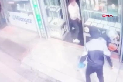 Güvenlik kamerasına yansıyan görüntülerde şüphelilerin kuyumcuyu darbedip biber gazı ile etkisiz hale getirdikten sonra altınları aldıkları soygun anı yer aldı.