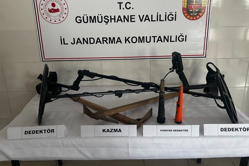 Gümüşhane İl Jandarma Komutanlığı Kaçakçılık ve Organize Suçlarla Mücadele Şube Müdürlüğü (KOM) ekiplerince yürütülen çalışmalar kapsamında, Şiran ilçesi Günyüzü köyü mevkiinde 2 şüpheli şahsın kaçak kazı yapacağı bilgisine ulaşıldı. KOM ve Şiran İlçe Jandarma Komutanlığı ekiplerince bölgeye düzenlenen operasyonda M.Ü. ve S.K. isimli şahıslar kaçak kazı yaparken suçüstü yakalandı. Olay yerinde yapılan aramada 3 adet alan tarama cihazı, 1 adet küçük alan tarama cihazı ile 2 adet kazma olmak üzere toplam 6 adet kaçak kazı malzemesi ele geçirilerek muhafaza altına alındı.