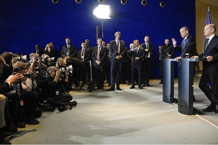 Hürriyet Gazetesi Ankara Temsilcisi Hande Fırat, basın toplantısında yaşananları şu sözlerle aktardı: Almanya'nın tarihte kendi yaptıklarını, İsrail başka bir millete yapıyor. Hamas'ı terör örgütü olarak gören Almanya topraklarında PKK ve FETÖ terör örgütüne ev sahipliği yapan bir ülke. Sanırım basın mensubu bunların hepsini biliyordur ama işine gelmediği için bu soruyu sordu. Cumhurbaşkanı Erdoğan da tavrını net bir şekilde ortaya koydu. Bu arada biz de soru soramadık. Provokasyon nitelikli sorudan sonra Türkiye'den gelen gazeteciler el kaldırdı. Biz de sorardık, gerçekleri açık açık sorardık. Alman basının bir kısmında farklı bir bakış açısı ile gelmiş.
