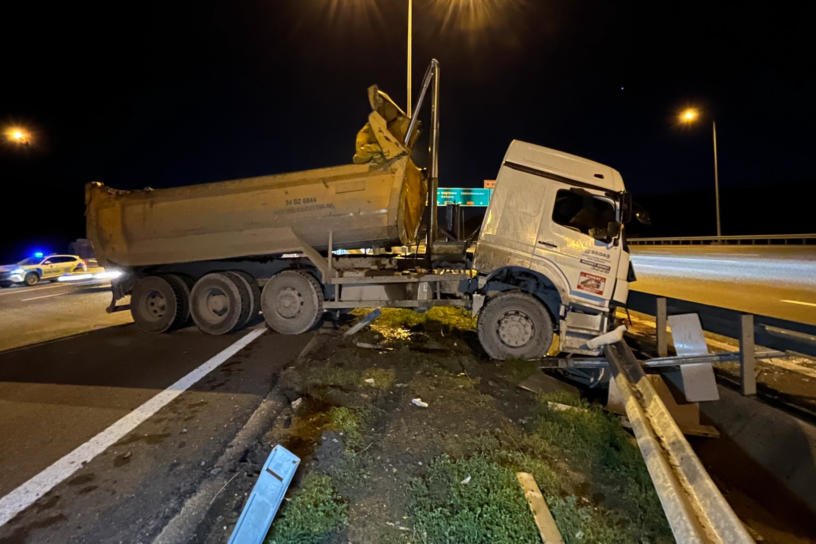 Kaza, akşam saatlerinde Kuzey Marmara Otoyolu Başakşehir Mevkii’nde meydana geldi. İddiaya göre B.T. kontrolündeki 34 DZ 6844 plakalı hafriyat kamyonunun dorsesi yol üzerindeki serbest geçiş sistemi (SGS) direğine vurdu. Kaza nedeniyle direksiyon hakimiyetini kaybeden sürücü, yolun sol şeridine geçerek bariyere girdi. İhbar üzerine olay yerine itfaiye, polis ve sağlık ekipleri sevk edildi. Araç sürücüsü, sağlık ekiplerinin ilk müdahalesinin ardından ambulansla hastaneye kaldırıldı. Sürücünün durumunun ağır olduğu öğrenilirken polis ekipleri tarafından yolda güvenlik önlemleri alındı. Hafriyat kamyonu yoldan kaldırılarak götürüldü.