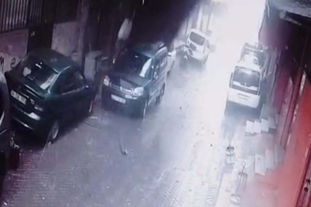 Görüntülerde sokak üzerinden geçen iki kişi ve motokuryenin savrulan çatının altında kalmaktan saniyelerle kurtulduğu görüldü.