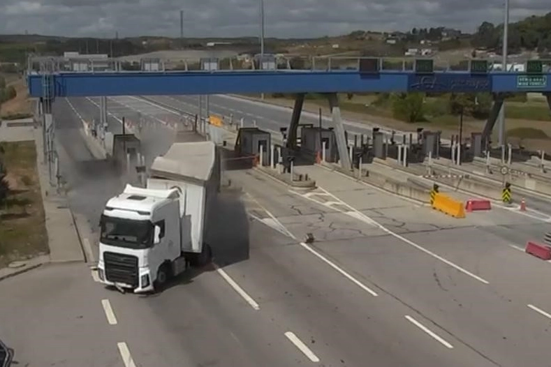 Güvenlik kamerasına yansıyan görüntülerde ise tırın gişelere yaklaşırken kontrolden çıktığı, önce gişelere ardından da jandarma aracına çarptığı görüldü.