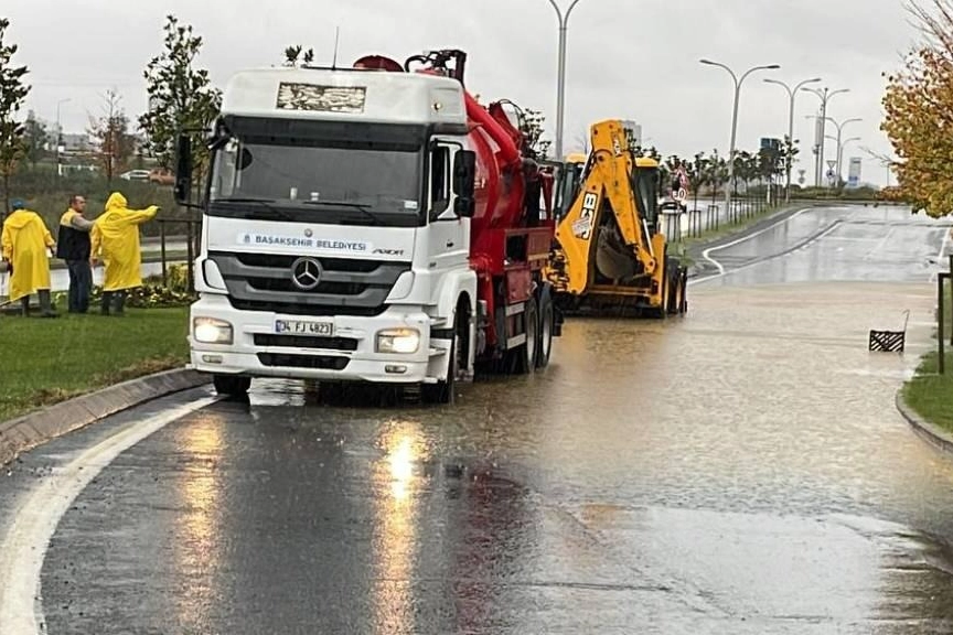 Başakşehir'de belediye ekipleri su biriken caddelerde vidanjörle suları çekerken mazgalların açık tutulması için temizlik yapıyor.