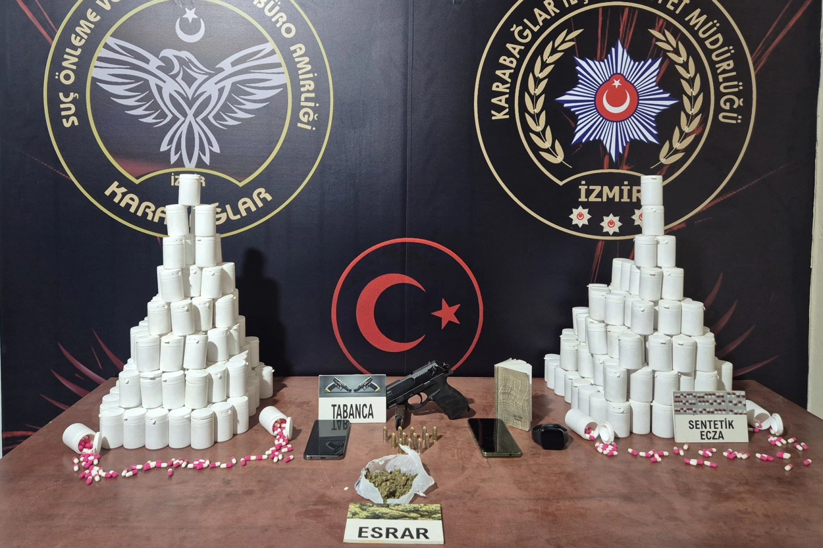 Karabağlar İlçe Emniyet Müdürlüğü Suç Önleme ve Soruşturma Büro Amirliği ekipleri, ilçede uyuşturucu madde kullanımı ve ticaretine yönelik yürüttükleri çalışmalarda A.K. (44) ve M.A.’nın (24) birlikte uyuşturucu sattığını ve sattıkları maddeleri Konak ilçesindeki bir ikamette sakladığını tespit etti. Adreslere eş zamanlı operasyon düzenleyen polis ekipleri, şüphelilerin adreslerinde yaptıkları aramada, 14 bin 642 adet uyuşturucu hap, 10.52 gram esrar ve 1 adet ruhsatsız tabanca ele geçirdi. Gözaltına alınan sevgililer, emniyetteki işlemlerin ardından çıkarıldıkları mahkemece tutuklandı.