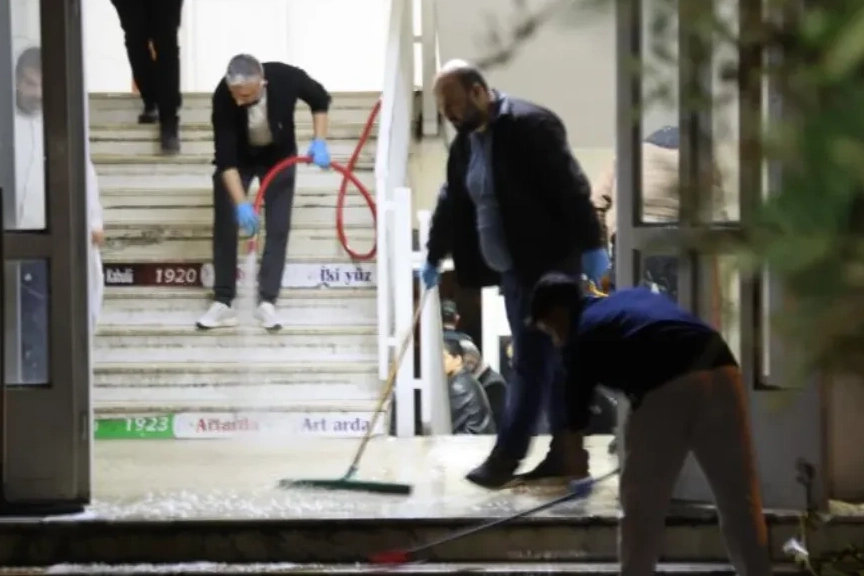Saldırının gerçekleştiği koridorlar ve sınıflarda temizlik çalışması başlatıldı. Görevlilerin okulun içini suyla yıkadığı anlar, bölgedeki acı tabloyu bir kez daha gözler önüne serdi.