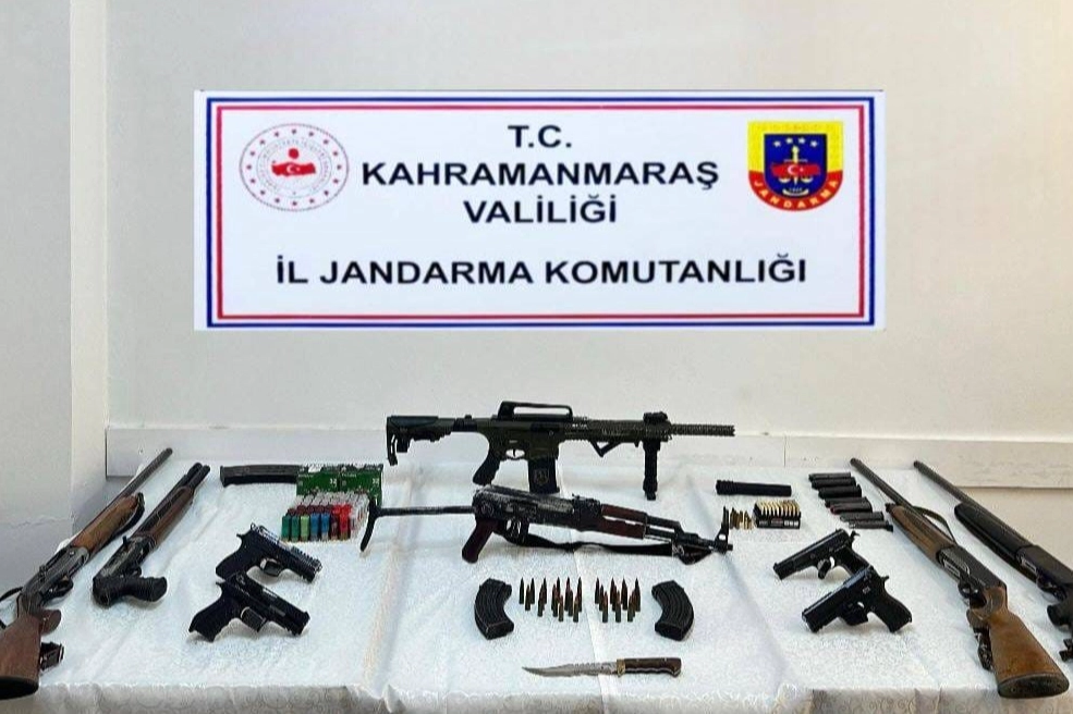 Onikişubat ilçesi Bulutoğlu Mahallesi’nde A.A. (68), O.K. (42) ve Y.A. (38) isimli şahısların ikametlerinde ve araçlarında yapılan aramada; 1 adet kalaşnikof piyade tüfeği, 4 adet ruhsatsız tabanca, 5 adet ruhsatsız av tüfeği, 30 adet 7.62 mm çapında kalaşnikof piyade tüfeği fişeği, 62 adet 9 mm tabanca fişeği, 96 adet av tüfeği fişeği, 2 adet kalaşnikof piyade tüfeği şarjörü, 12 adet tabanca şarjörü, 3 adet av tüfeği şarjörü, 1 adet susturucu ve 1 adet komando bıçağı ele geçirildi. Olayla ilgili gözaltına alınan 3 şüpheli, işlemlerinin ardından adliyeye sevk edildi. Şüphelilerden 2’si çıkarıldıkları mahkemece tutuklanırken, 1 kişi hakkında adli işlem başlatıldı.