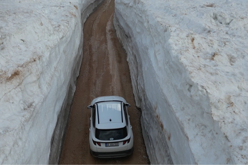 Kış şartlarının etkisini yoğun şekilde hissettirdiği bölgede, yer yer metrelerce yüksekliğe ulaşan kar kütleleri dikkat çekti. Görüntülerde, yolun iki tarafında duvar gibi yükselen kar birikintileri arasında kalan güzergâh, doğa şartlarının sertliğini gözler önüne serdi.