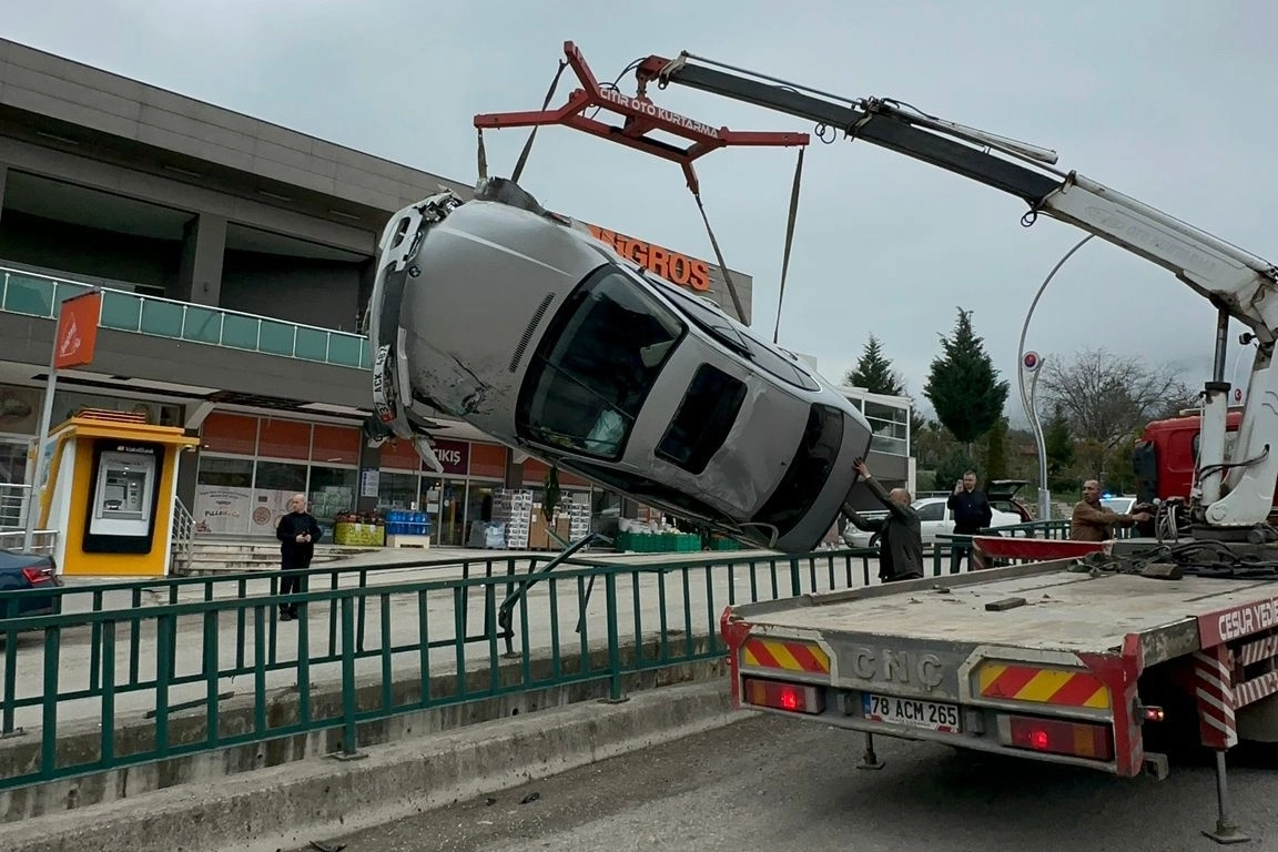 Çarpmanın etkisiyle savrulan otomobil su kanalına düştü, kazada fırlayan demir parçası da park halindeki başka araca isabet ederek hasara yol açtı.