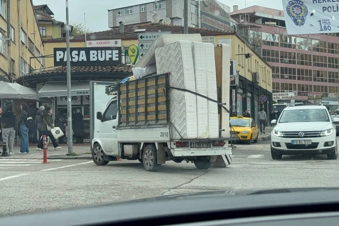 Olay, Albay Karaoğlanoğlu Caddesi üzerinde meydana geldi. Seyir halindeki kamyonetin kasasında yüklü bulunan baza ve beş yataktan biri yeterince sabitlenmediği için yola düştü. Ancak tamamen kopmayan yatak, halatla bağlı olduğu yerden sürüklenmeye devam etti. Kaldırımda yürüyen iki vatandaş durumu fark ederek sürücüyü uyardı. Uyarılara rağmen kamyonet sürücüsünün yoluna devam etmesi ise dikkat çekti. O anlar, arkadan gelen bir araç sürücüsü tarafından cep telefonu kamerasıyla kayda alındı.