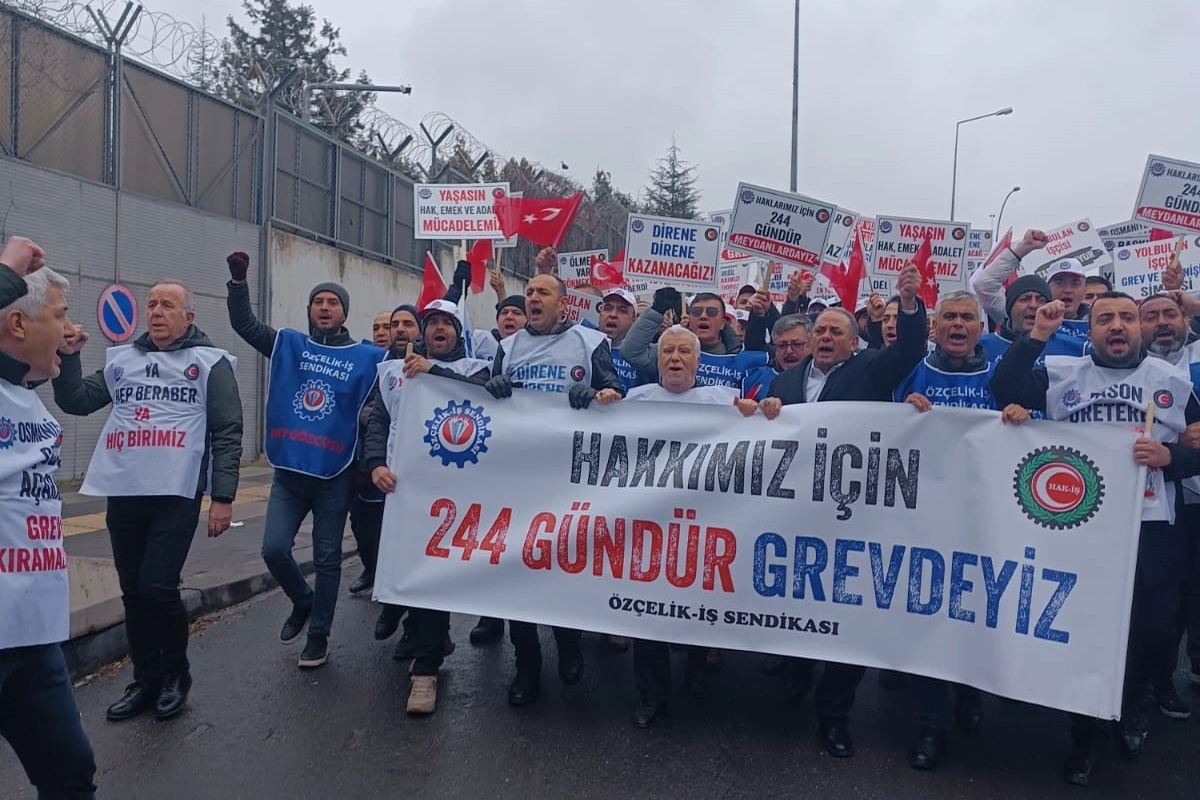 Özçelik-İş Sendikası Genel Başkanı Yunus Değirmenci liderliğinde Hatay’dan Ankara’ya gelen Yolbulan Metal işçileri, polis eşliğinde AŞTİ Ankaray durağı bölgesinden Çalışma Bakanlığı’nın önüne yürüdü.