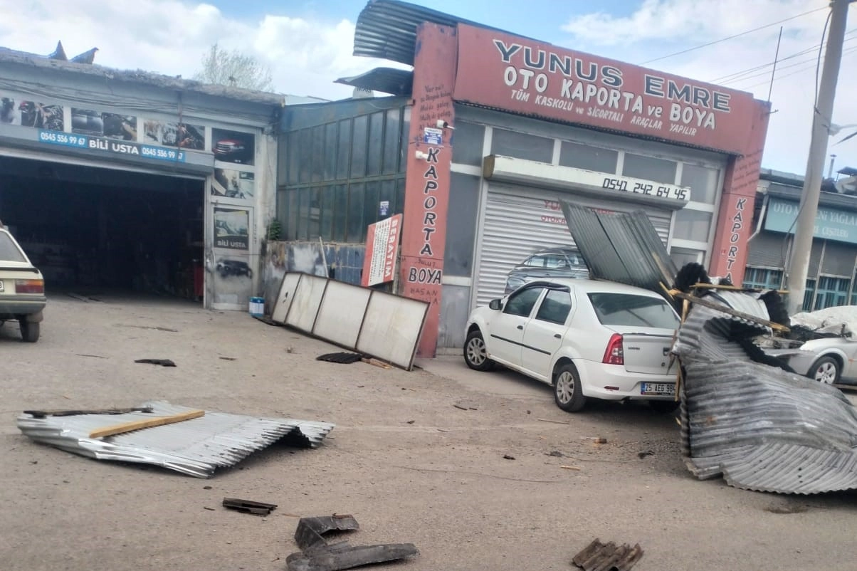 Kars’ta öğlen saatlerinde etkili olan şiddetli rüzgar nedeniyle Küçük Sanayi Sitesi’ndeki 2 iş yerinin çatısı yerinden koparak park halindeki aracın üzerine düştü. Otomobilde maddi hasar meydana gelirken, rüzgarın savurduğu çatı parçaları ise kaldırıldı.