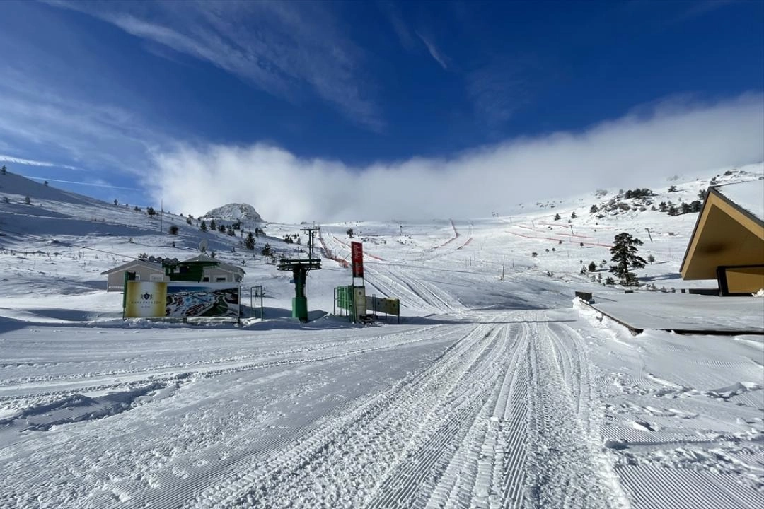 Kentin yüksek kesimlerinde etkili olan kar yağışıyla birlikte kayak merkezindeki pistlerde karla kaplandı.
