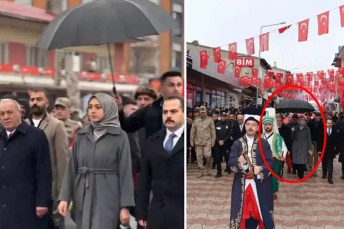Erzincan'ın Tercan ilçesinin kurtuluş günü etkinliklerinde kaydedilen bir görüntü sosyal medyada tartışma yarattı. İlçe Kaymakamı Neslihan Kısa Duman'ın şemsiyesini, koruma polisinin taşıdığı görüldü.