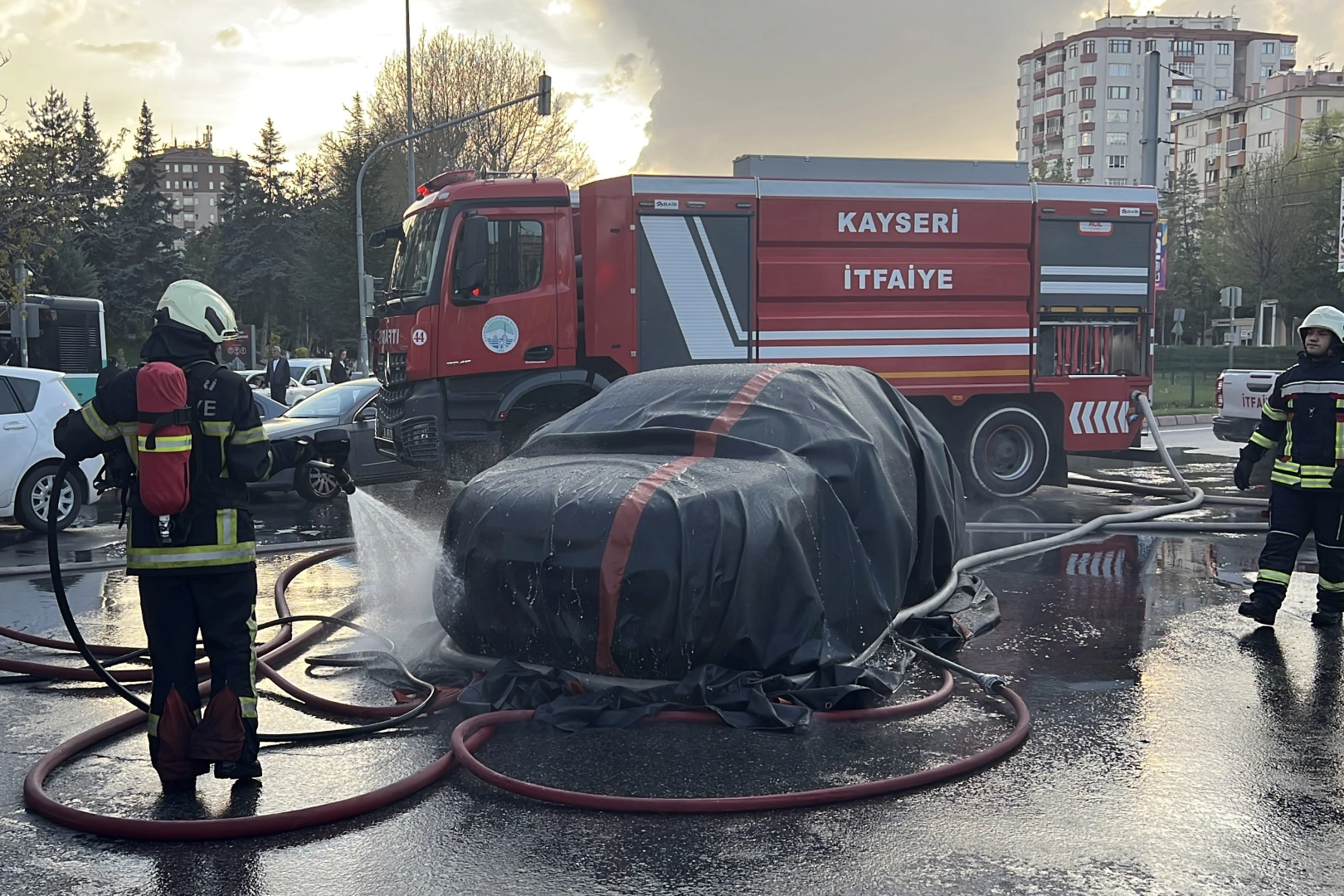 Melikgazi ilçesi Alparslan Mahallesi Sivas Bulvarı'nda saat 18.00 sıralarında, Z.K. idaresindeki 06 UM 3818 plakalı elektrikli otomobil, seyir halindeyken alev aldı. İhbar üzerine bölgeye itfaiye ve polis ekipleri sevk edildi. İtfaiye ekipleri, alevler içindeki elektrikli otomobilin üzerine yangın battaniyesi örterek, altından su ile müdahale etti. Ekiplerin yaklaşık 1 saatlik çalışmasıyla otomobildeki yangın söndürüldü. Otomobilde hasar meydana gelirken, yangının çıkış nedeninin belirlenmesi için inceleme başlatıldı.
