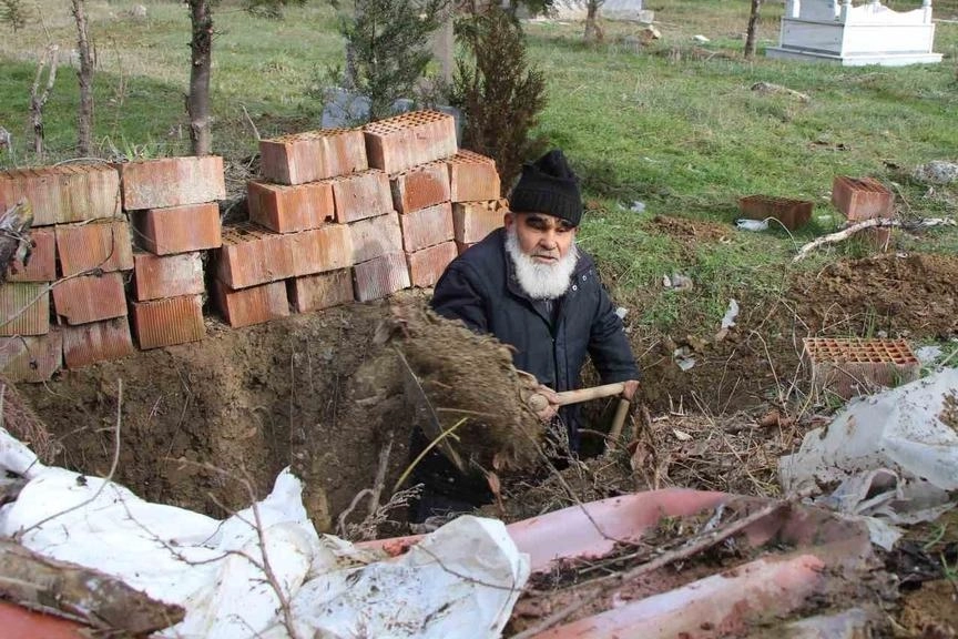 Çiftçilikle uğraşan ve eşiyle birlikte köyde yaşayan Karabela, kazma ve kürekle toprağı kazıp hazırladığı mezarını büyük bir özenle oluşturdu.
